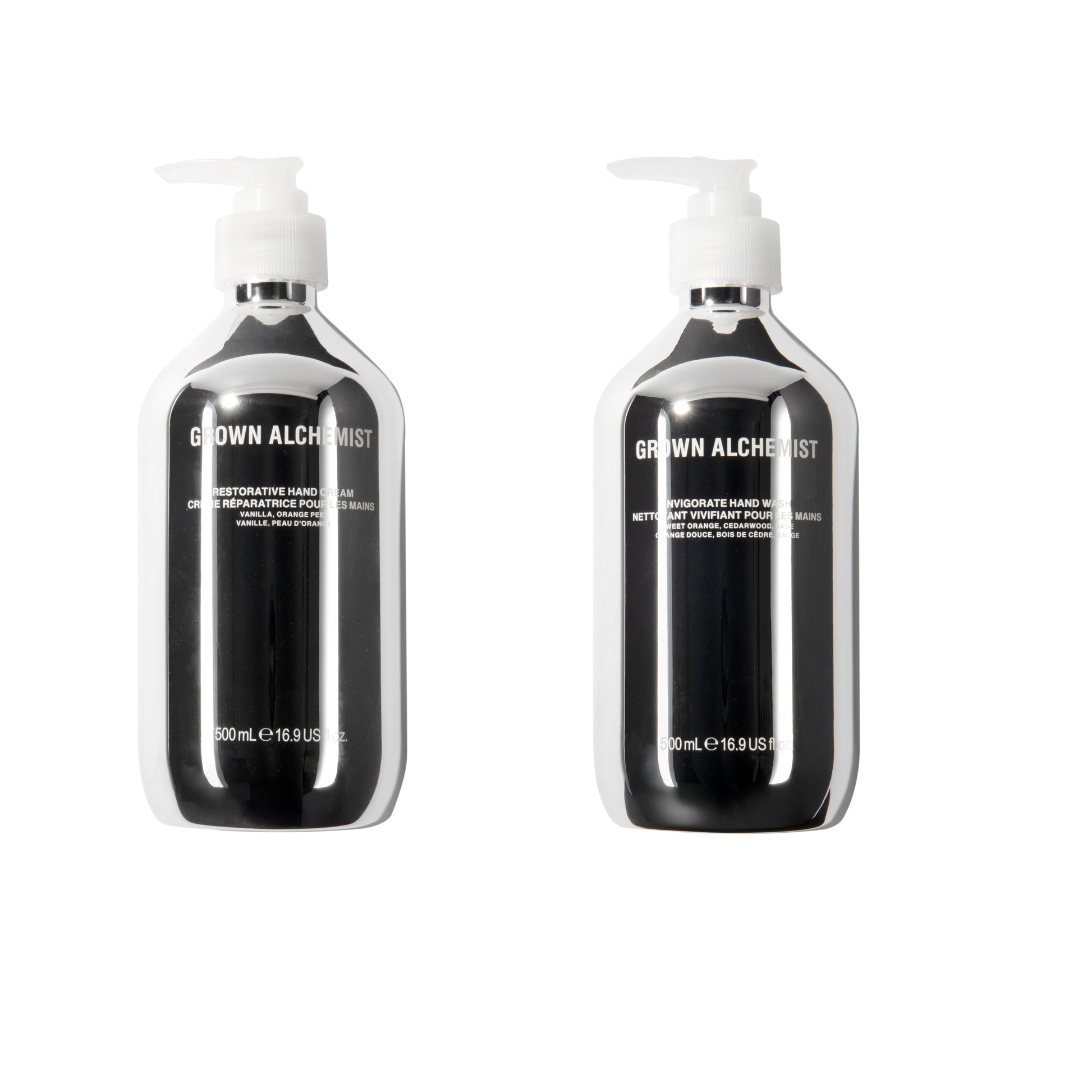 Best-selling Invigorate Hand Wash and Restorative Hand Cream in iconic Mirror Chrome Edition bottles. Keeping hands hydrated is critical to support the skin's moisture barrier. This nourishing duo contains a blend of ingredients to cleanse without stripping, replenish and hydrate for soft, supple hands.
