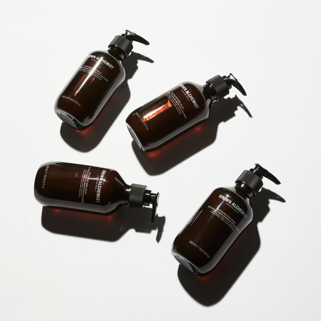Brown bottle with pump labeled 'Grown Alchemist' on a white background