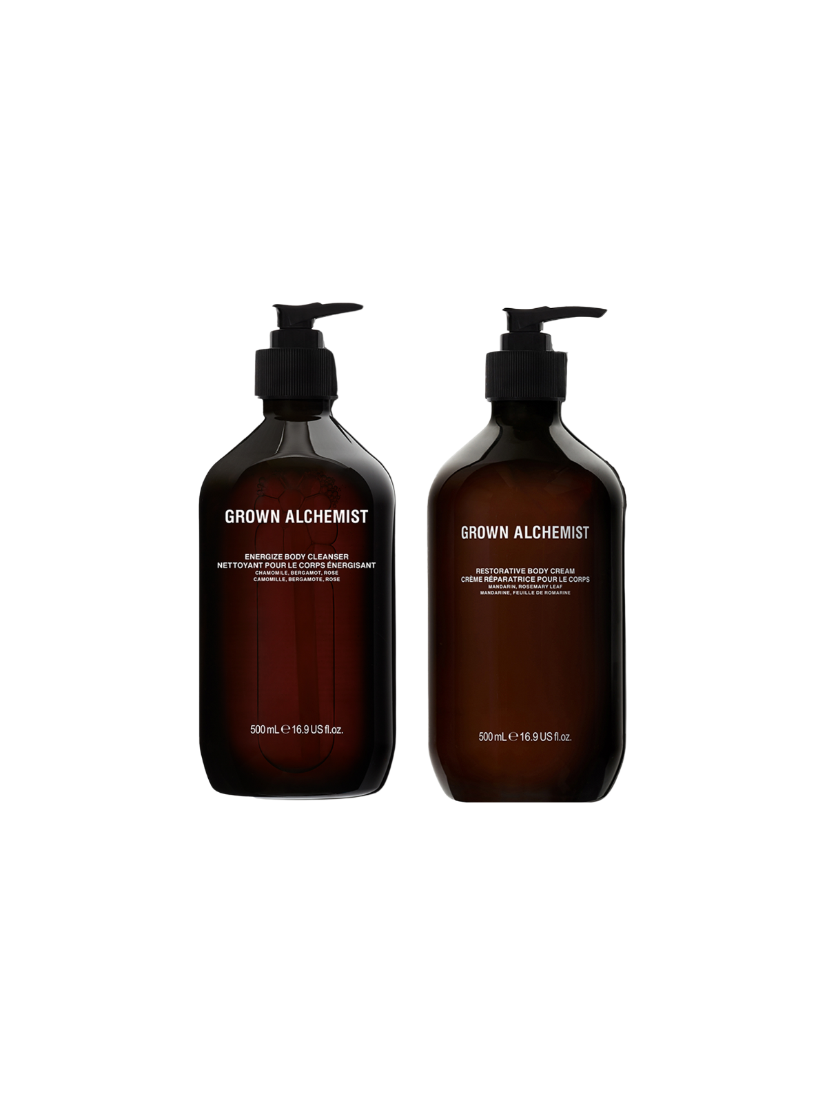 The sulfate-free wash refreshes with Peppermint, Grapefruit, and Rosemary while maintaining skin balance. Follow with the Restorative Body Cream, a rich yet fast-absorbing moisturizer powered by Aloe, Shea Butter, and Camellia Oil to strengthen and protect the barrier.